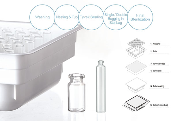 Seek new manufacturing solutions in the pharmaceutical industry,increase flexibility and quality,and shorten time to market.While reducing operating costs(WFI,electricity)and increasing profits.The ready to fill glass containers minilize pharmaceutical company cost pressures and avoiding the demand for clean room space in the context of outsourcing non-nuclear clean rooms.Thanks to the speical design of glass to glass non-contact packaging material,the quality is higher than that of bulk configuration,which ensures the apperance quality and at the same time reduces the damage.Combined by nestboard and the nest tub.You will be able to efficiently place multiple nest tubs on the same machine.Simplify lyophilization and conveniently place the nest tubs into the freeze dryer without the need for additional loading tools.After the porduct is cleaned,it is placed in a nest tub covered by Tyvek sheet and sealed by Tyvek lid.Finally ETO sterilized after the bags packedy into cartons.